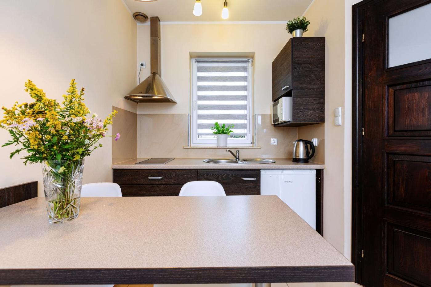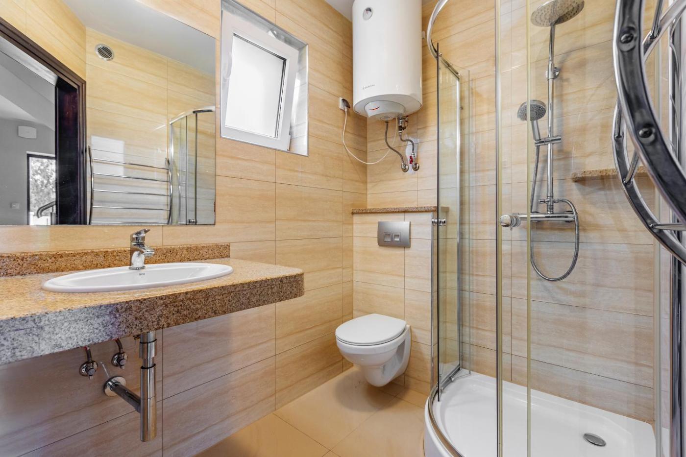 Domek z 2 sypialniami. This chalet features a fireplace. Boasting a private entrance, this chalet features 1 living room, 2 separate bedrooms and 1 bathroom with a shower. Guests will find a stovetop, a refrigerator, kitchenware and a microwave in the kitchen. The chalet also comes with a barbecue. A seating area with a flat-screen TV, a dining area and a terrace are offered in this chalet. The unit has 5 beds. Domek - 8 osobowy. Powierzchnia pokoju ok.: 70 mkw. ;